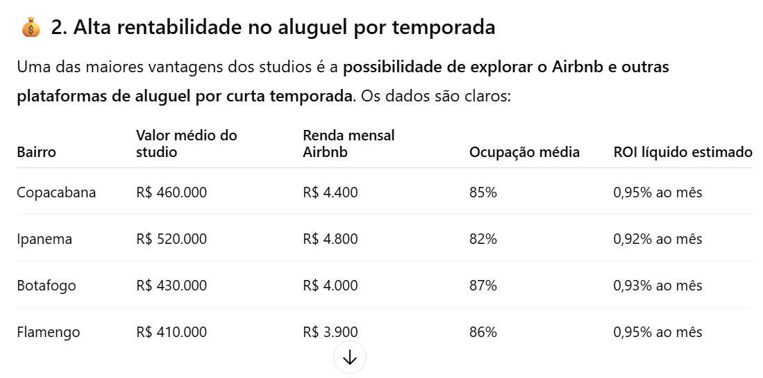 Um studio comprado por R$ 480 mil em Copacabana, alugado por R$ 240 a diária, com ocupação de 25 dias por mês, gera: