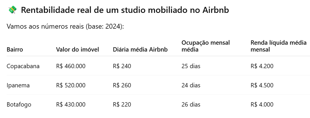 Yes. A well-located, fully furnished studio in Rio de Janeiro can yield 0.9?1.1% net per month via Airbnb, especially in neighborhoods like Copacabana and Ipanema. It?s a low-risk, high-demand, high-profit investment.